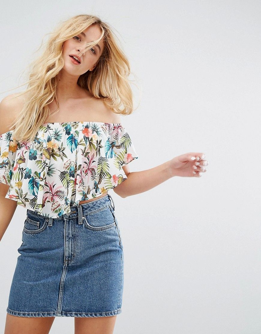 • Bershka - Top court style Bardot à imprimé tropical - Multi