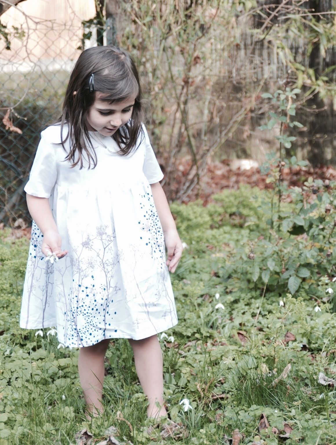 Robe en satin de coton blanc. Manches courtes. Boutonnage par boutons recouverts dans le dos. Sérigraphie « Un rond dans l’eau » Chaque sérigraphie...