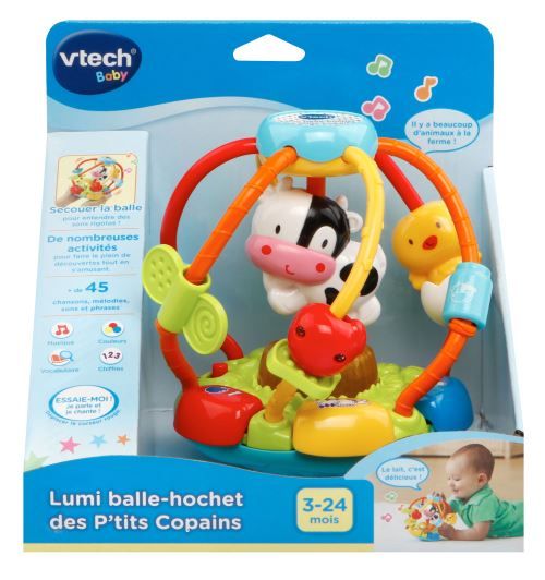 Lumi balle-hochet des P´tits Copains - 3 - 24 mois Une balle parlante et lumineuse à secouer pour éveiller Bébé ! Grâce au capteur de mouvement, Bébé secoue la balle-hochet et déclenche des sons rigolos. 3 boutons colorées pour découvrir les premiers chiffres, les couleurs, déclencher des phrases amusantes, écouter des chansons et des mélodies entraînantes. De nombreux éléments à manipuler dont une vache à faire tourner et un petit poussin pour encourager la motricité. 15 mélodies entraînantes