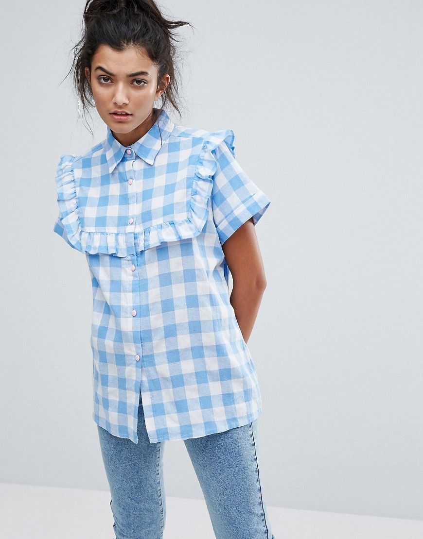 • Lazy Oaf - Chemise à carreaux vichy et volant - Bleu