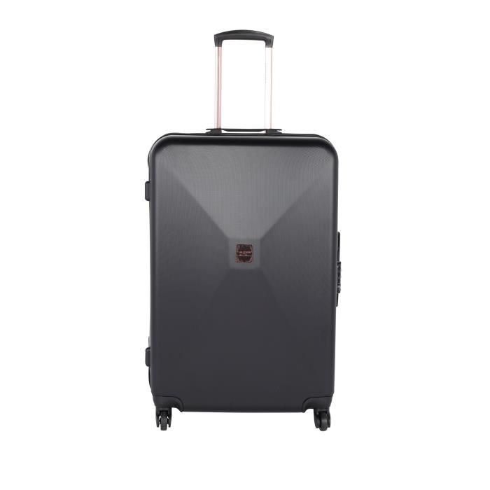 Valise 4 roues en ABS de coloris noir. Grand format : 75x46x31 cm. Syst?me trolley avec bouton poussoir. Poignées de portage latérale et supérieure. Ouverture zippée ? double curseur + Cadenas ? combinaison. Deux compartiments zippés, 2 poches de rangement en filets zippées et 2 poches élastiquées.