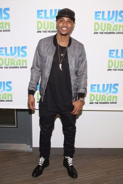 Trey Songz présent au "Elvis Duran Z100 morning show" portait une veste Dolce & Gabbana ainsi que des chaussures Stampd.