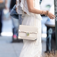 L'ancienne star Disney repérée devant son appartement revisite la tendance sixties avec cette longue robe fluide et ces lunettes rondes.