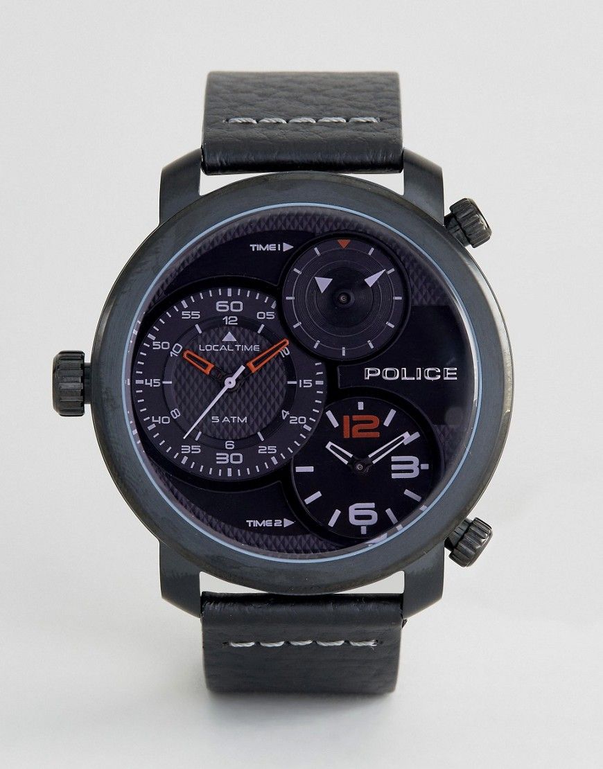 Montre par Police, Bracelet en cuir véritable, Boîtier en acier inoxydable, Sous-cadran chronographe, Remontoir sur un côté, Deux poussoirs, Fermeture par boucle à ardillon, 5 ATM : Étanche à l'eau jusqu'à 50 mètres (160 pieds), Article présenté dans une boîte griffée.
