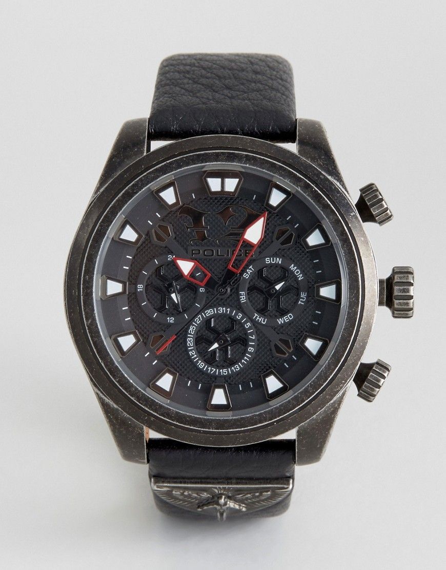 Montre par Police, Bracelet en cuir véritable, Boîtier en acier inoxydable, Mouvement à trois aiguilles, Sous-cadran chronographe, Repères traits, Remontoir sur un côté, Deux poussoirs, Fermeture par boucle à ardillon, 5 ATM : Étanche à l'eau jusqu'à 50 mètres (160 pieds), Article présenté dans une boîte griffée.