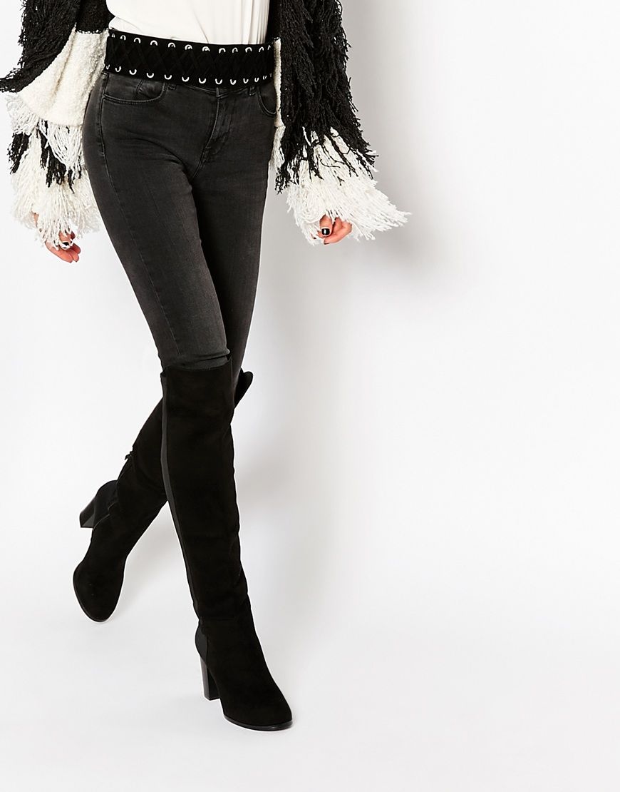 Chaussures par Truffle Tige en imitation daim Longueur mi-cuisses Bord asymétrique Empiècement élastique à l'arrière Modèle à enfiler Bout en amande Gros talon haut Essuyer avec un chiffon humide Tige 100% textile Talon : 8 cm (3 po)
